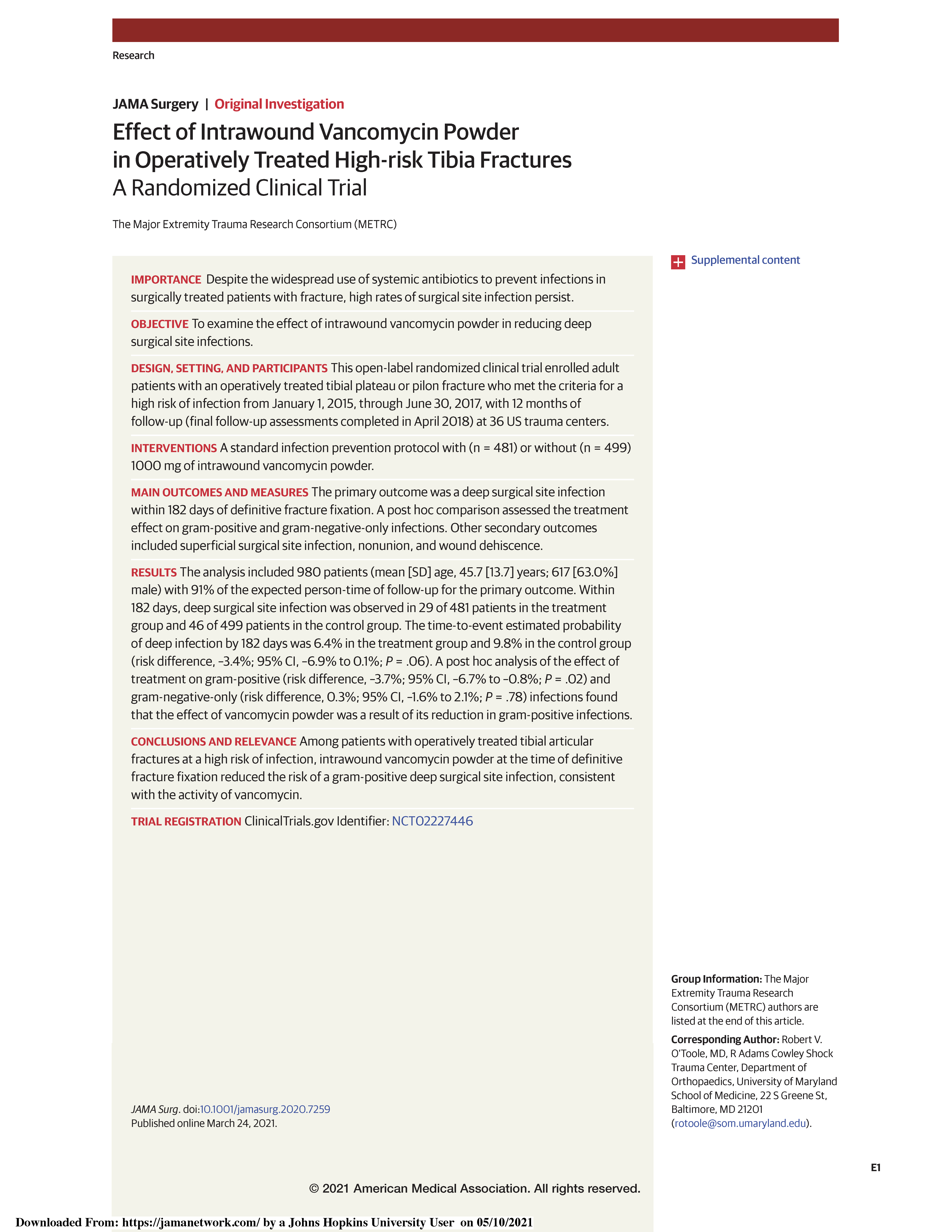 - Effect of Intrawound Vancomycin Powder in Operatively Treated High-risk Tibia Fractures: A Randomized Clinical Trial.