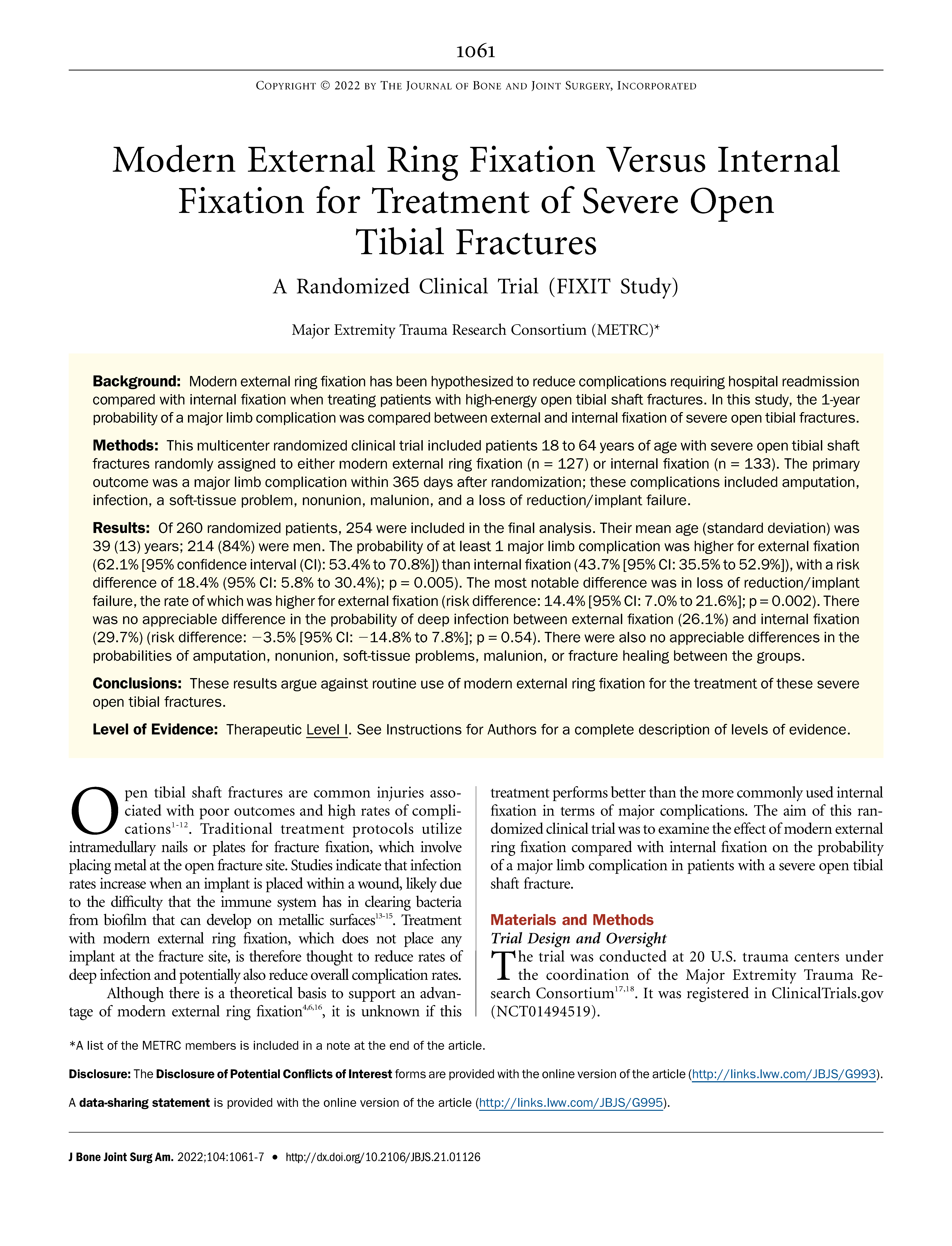 - Modern External Ring Fixation Versus Internal Fixation for Treatment of Severe Open Tibial Fractures: A Randomized Clinical Trial (FIXIT Study).