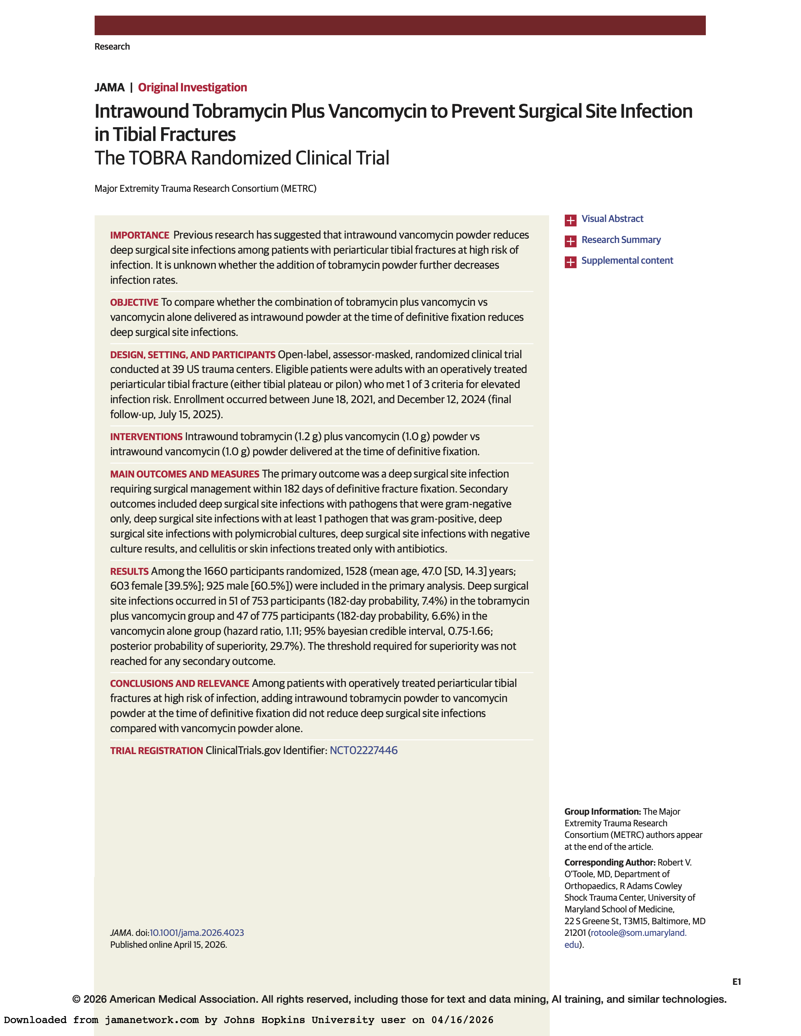 - Intrawound Tobramycin Plus Vancomycin to Prevent Surgical Site Infection in Tibial Fractures: The TOBRA Randomized Clinical Trial.