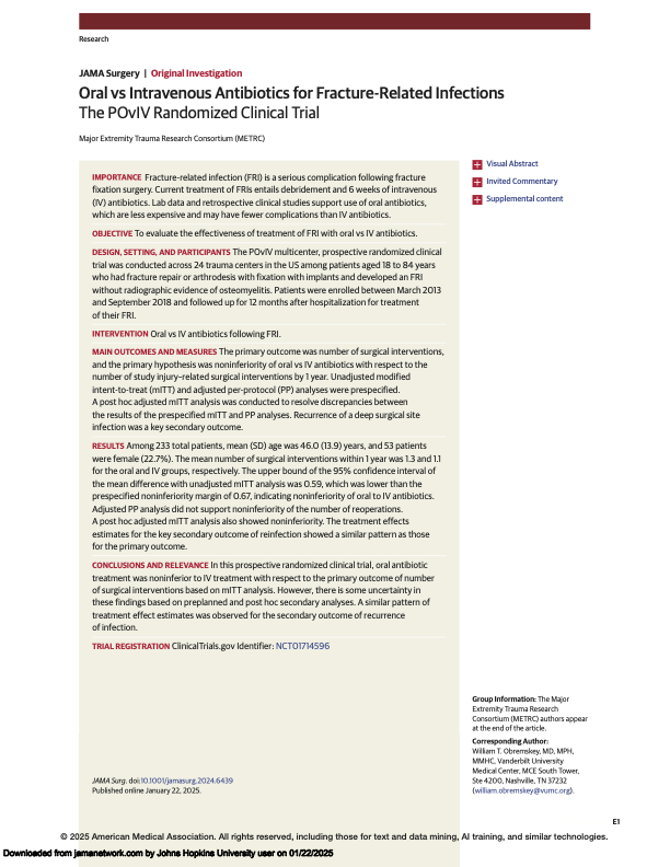 - Oral vs Intravenous Antibiotics for Fracture-Related Infections: The POvIV Randomized Clinical Trial.