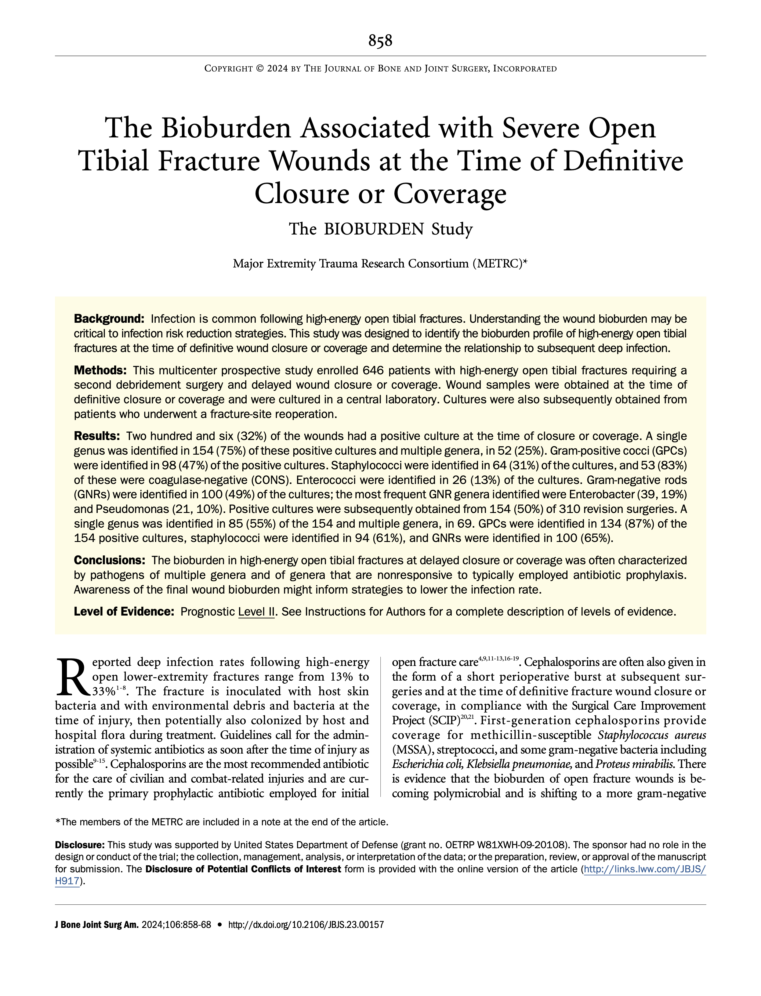 - The Bioburden Associated with Severe Open Tibial Fracture Wounds at the Time of Definitive Closure or Coverage: The BIOBURDEN Study.