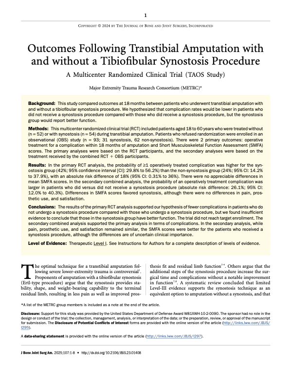 - Outcomes Following Transtibial Amputation with and without a Tibiofibular Synostosis Procedure: A Multicenter Randomized Clinical Trial (TAOS Study).