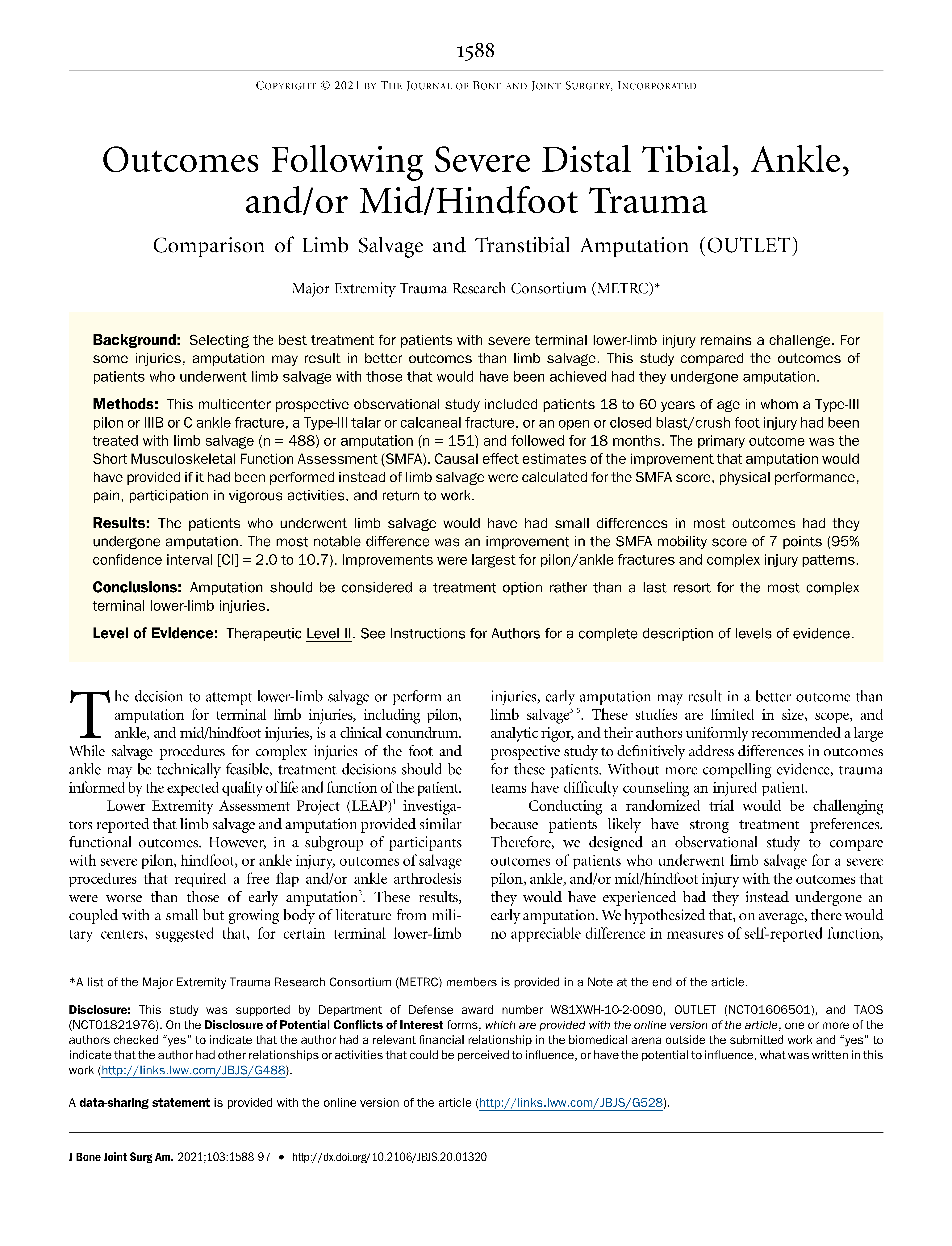 - Outcomes Following Severe Distal Tibial, Ankle, and/or Mid/Hindfoot Trauma: Comparison of Limb Salvage and Transtibial Amputation (OUTLET).