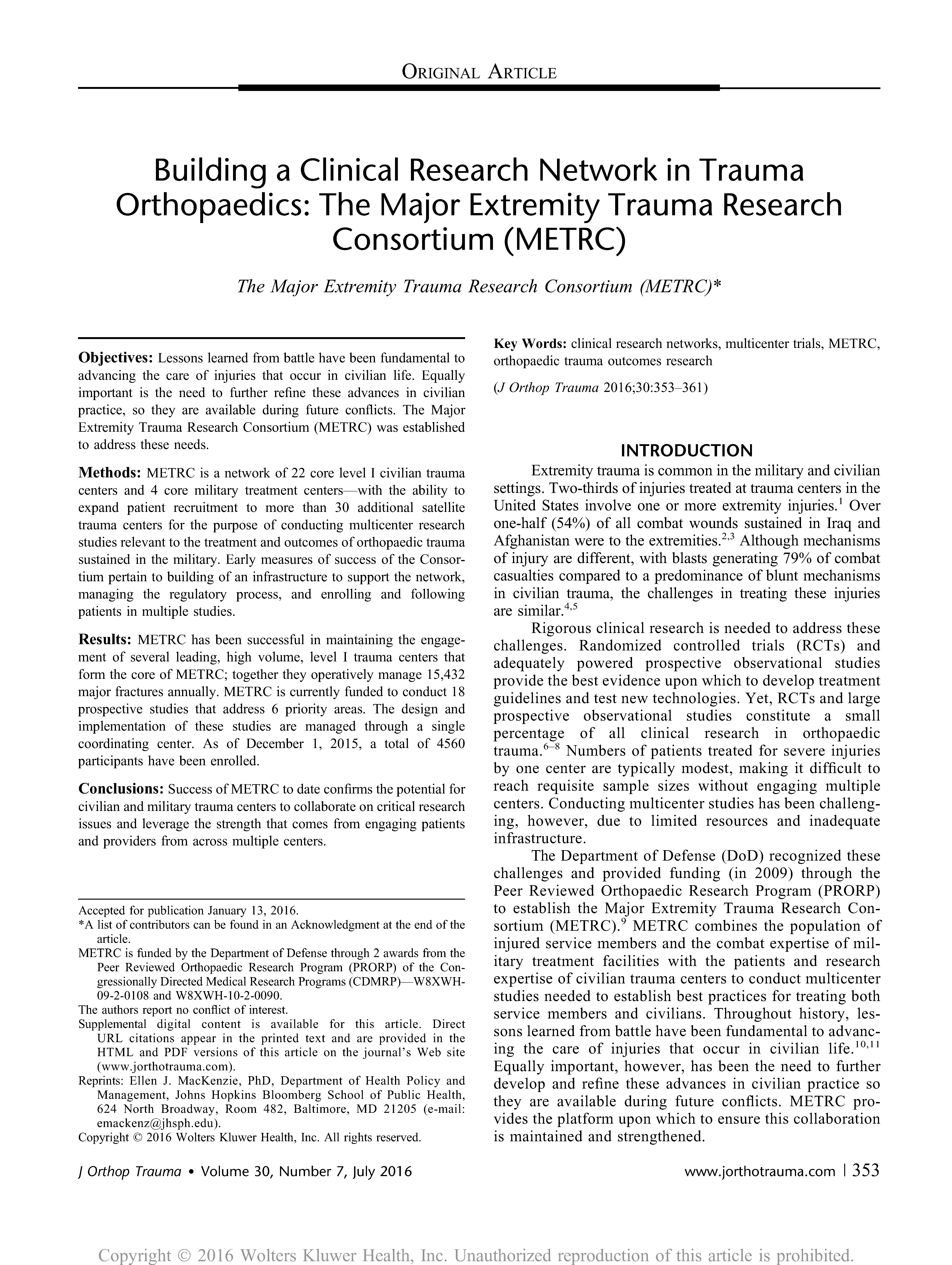 - Building a Clinical Research Network in Trauma Orthopaedics: The Major Extremity Trauma Research Consortium (METRC).